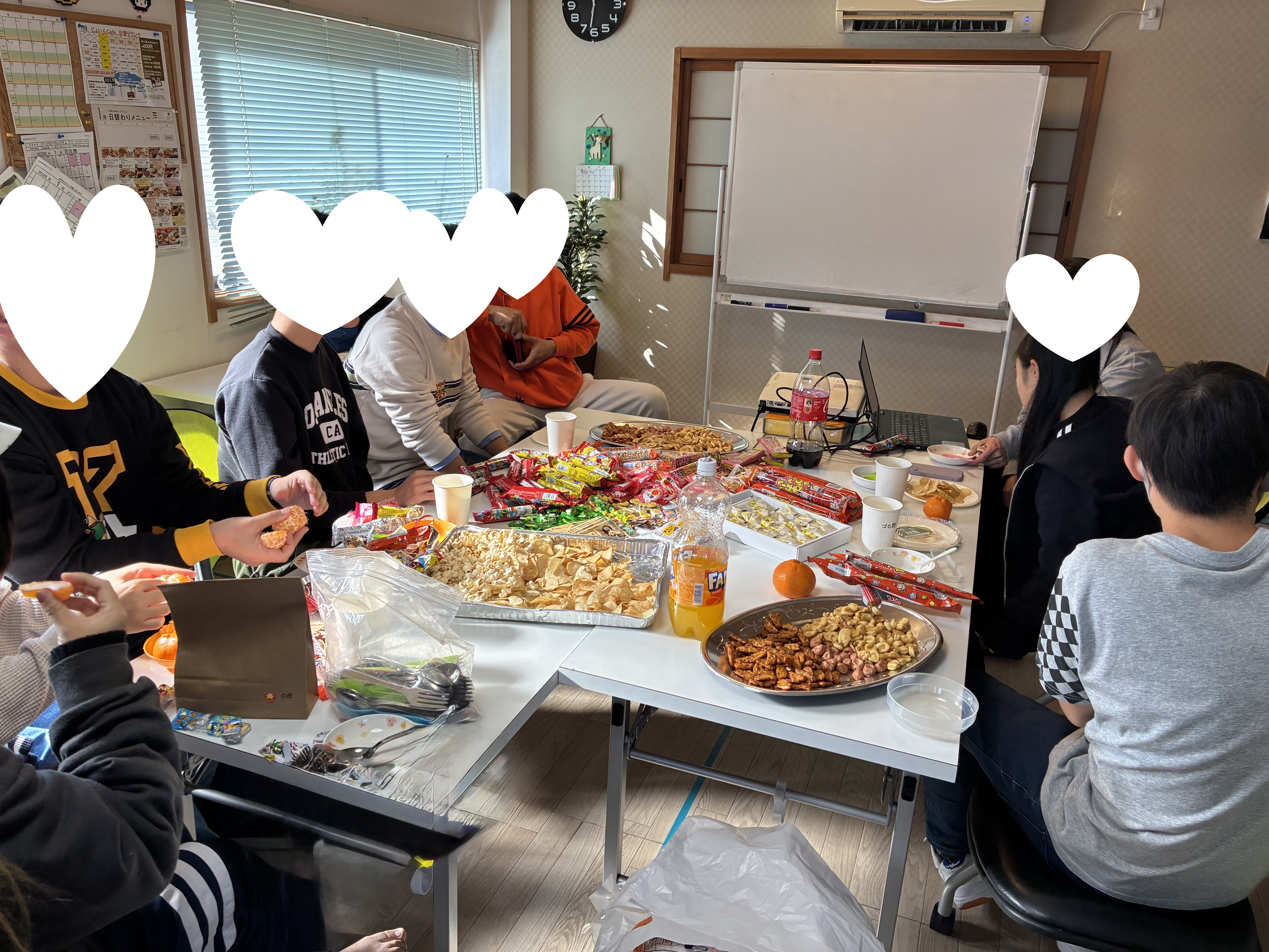 20(土)にクリスマス会をしました。メニューは「ケーキ寿司」「そばめし」「たこやき」「パンケーキ」「みたらし団子」「ポテト、ナゲット」「コーラゼリー」と盛りだくさん。メンバーは調理実習と同様にそれぞれが自分の作りたいものを選んで担当します。スタッフやOBにも手伝ってもらいながら作ります。食事はビュッフェスタイル。自分の好きなものを自由におかわりできます。そしてみんなに「美味しい」と言ってもらえるとうれしそうに笑顔満面。ビンゴでプレゼント交換。じゃんけん大会やトランプ探しなどゲームも楽しみました。お腹もいっぱい、お土産もいっぱい。今年のクリスマス会も大盛況、1年がんばったご褒美のような1日でした。